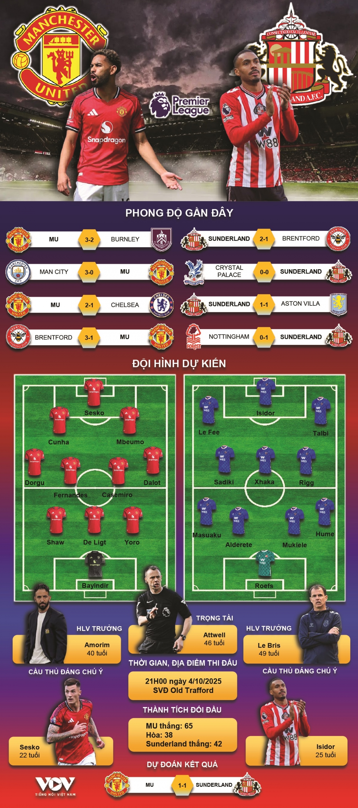 VOV.VN - Dự đoán kết quả và đội hình ra sân trận MU vs Sunderland thuộc khuôn khổ vòng 7 Ngoại hạng Anh 2025/2026 diễn ra lúc 21h00 ngày 4/10.