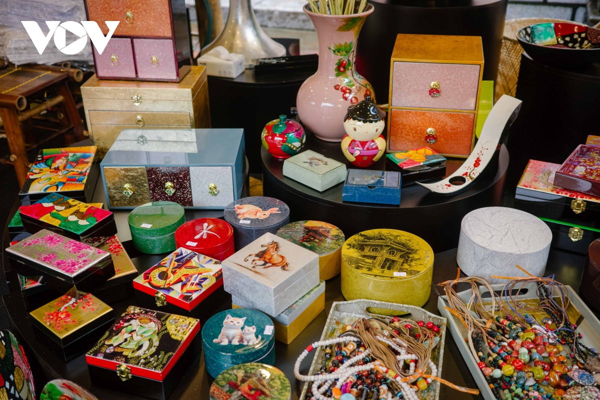 Gian trưng bày sơn mài Hạ Thái thu hút ánh nhìn với những chiếc bình, khay, hộp tinh xảo. Mỗi đường nét đều kể câu chuyện di sản Hà Nội, nơi truyền thống gặp gỡ sự sáng tạo đương đại.