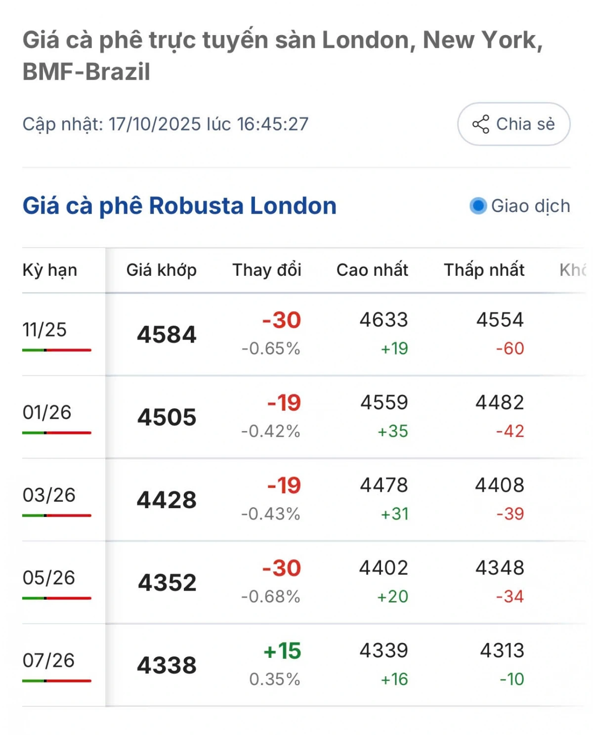 Giá cà phê thế giới chiều 17/10 (theo giờ Việt Nam) đều giảm trên 2 sàn giao dịch quốc tế. Cụ thể, giá cà phê Robusta hợp đồng kỳ hạn giao tháng 11/2025 trên sàn London quay đầu giảm 0,65%, tương đương giảm 30 USD/tấn, giá giao dịch đang là 4.584 USD/tấn. Cùng lúc giá cà phê Arabica trên sàn New York kỳ hạn giao tháng 12/2025 giảm 0,08% xuống mức 393,45 US cent/lb, tương đương giảm 0,35 cent/lb.