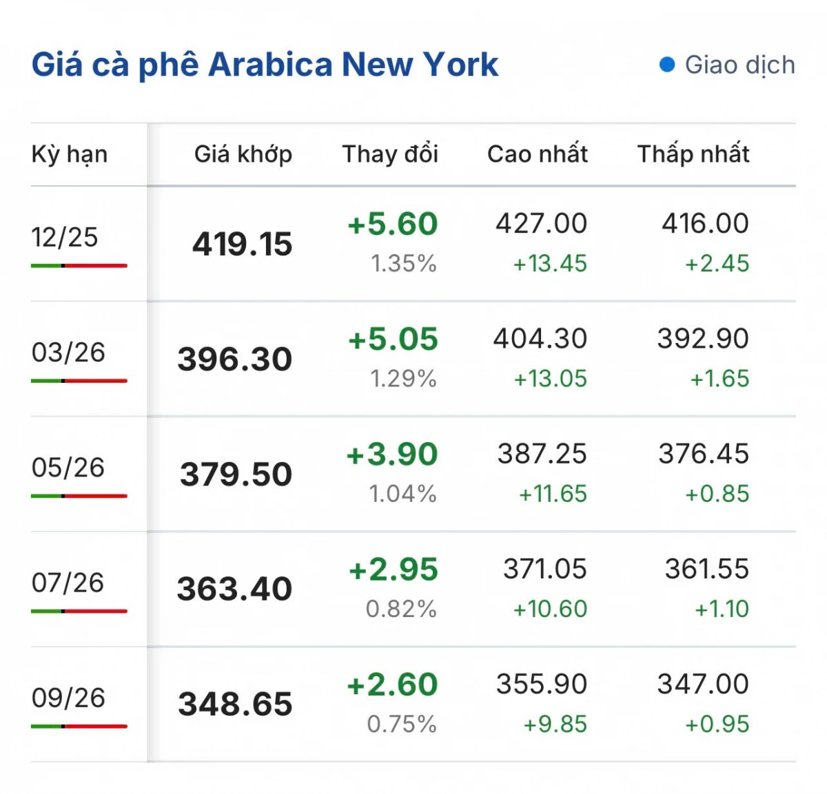 Cùng chiều tăng, giá cà phê Arabica trên sàn New York kỳ hạn hợp đồng giao tháng 12/2025 đã lên mức 420,85 US cent/lb, sau khi tăng 1,77%, tương đương tăng 7.30 US cent/lb so với chốt phiên trước.