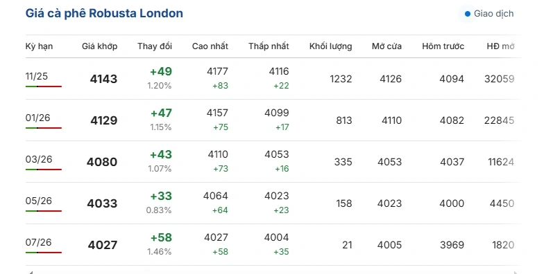 Giá cà phê trên thị trường thế giới sáng ngày 4/10 (theo giờ Việt Nam) đồng loạt tăng; so với phiên giao dịch gần nhất, giá cà phê Robusta London dao động ở mức 4.211 – 4.588 USD/tấn. Cụ thể, giá cà phê Robusta hợp đồng kỳ hạn giao tháng 11/2025 trên sàn London tăng 4,74%, tương đương 205 USD/tấn, giao dịch ở mức 4.527 USD/tấn.