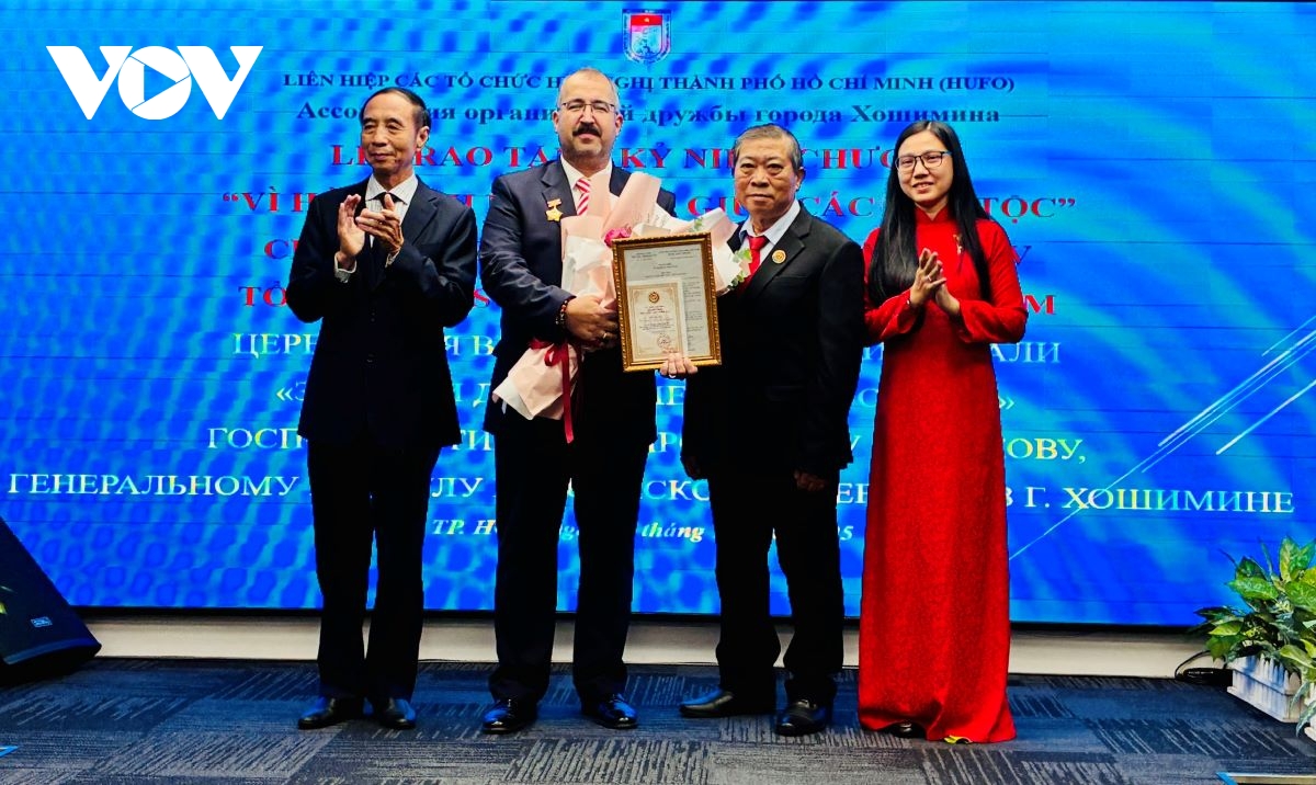 Sáng 7/11, tại TP.HCM, Liên hiệp các tổ chức hữu nghị và Hội Hữu nghị Việt - Nga TP tổ chức họp mặt kỷ niệm 108 năm Cách mạng Tháng Mười Nga (7/11/1917 - 7/11/2025) và trao Kỷ niệm chương “Vì hòa bình, hữu nghị giữa các dân tộc” cho ông Timur Sirozhevich, Tổng Lãnh sự Liên bang Nga tại TP.HCM.