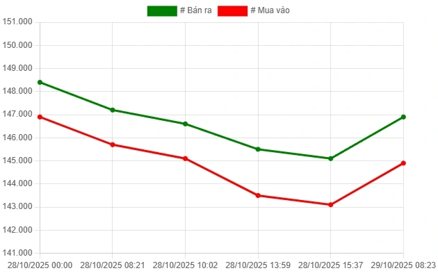 Trong khi đó, sáng 30/10, giá vàng nhẫn được SJC niêm yết ở mức 142,6 – 145,1 triệu đồng/lượng (mua – bán), giảm 1,2 triệu đồng/lượng ở cả 2 chiều so với chốt phiên giao dịch trước đó.