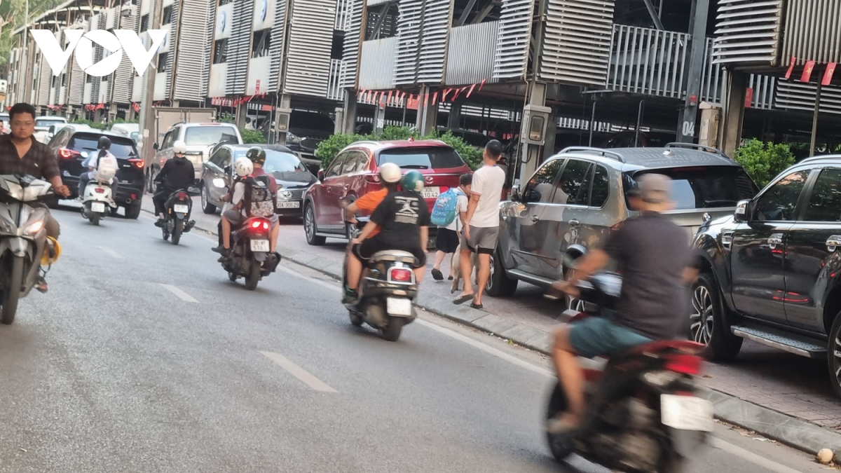 ... ngày cũng như đêm, ô tô đậu kín vỉa hè, học sinh đành đi bộ xuống lòng đường hoặc đi trên vỉa hè phía ngược chiều, rất nguy hiểm