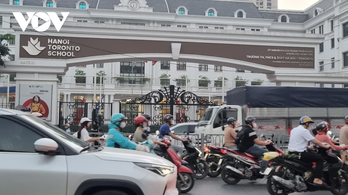 Trước cổng trường Tiểu học, THCS & THPT Hà Nội - Toronto và trường THPT chuyên Hà Nội - Armsterdam, giao thông luôn luôn đông đúc, ùn tắc