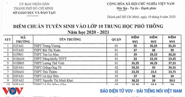 VOVVN - Sở GD-ĐT TP.HCM vừa công bố điểm chuẩn vào lớp 10 năm học 2020-2021.