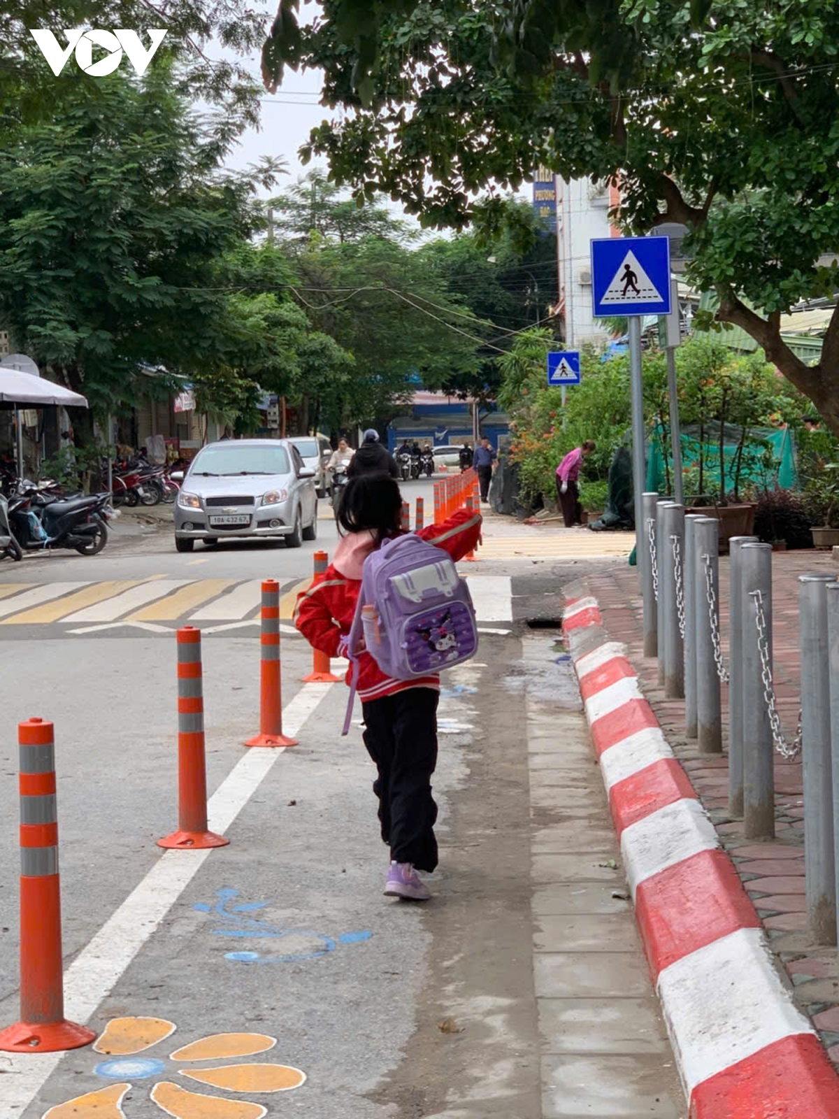 Dẫn chúng tôi đi tham quan con đường vào trường, cô Nguyễn Thanh Vân cho hay, trước đây, vỉa hè khu vực trường học bị sụt lún, người dân tập kết rác ở đây. Dưới lòng đường, ô tô đỗ, lấn chiếm hết lối đi bộ vào trường của học sinh, biến cổng trường thành nơi quay đầu xe. Các phương tiện giao thông qua đây thì phóng nhanh, dù đã có biển cấm đỗ, cấm quay đầu. Từ ngày có dự án này, tình trạng đó không còn nữa. Những cọc tiêu được chôn dọc theo vỉa hè, gờ giảm tốc phát huy tác dụng. Vỉa hè được xây dựng, tôn cao, mở rộng.