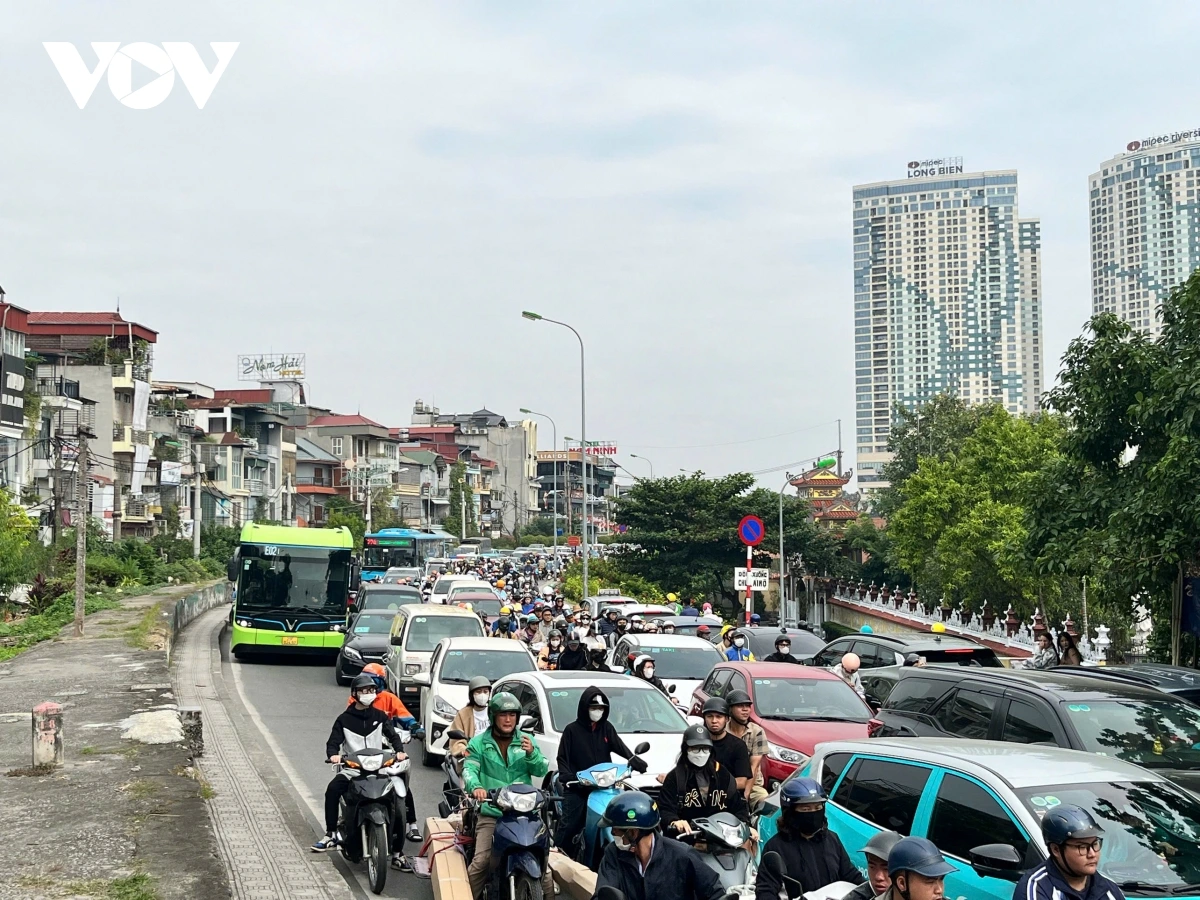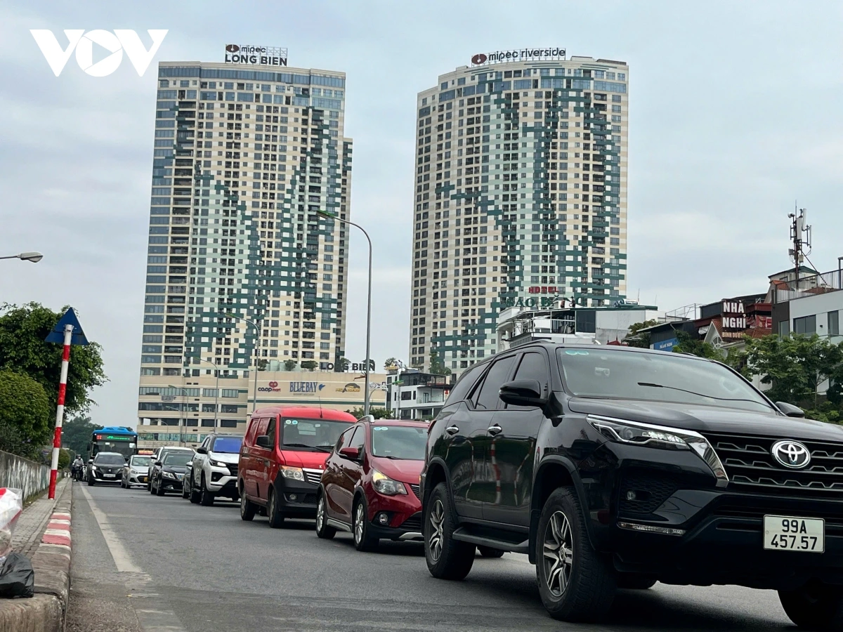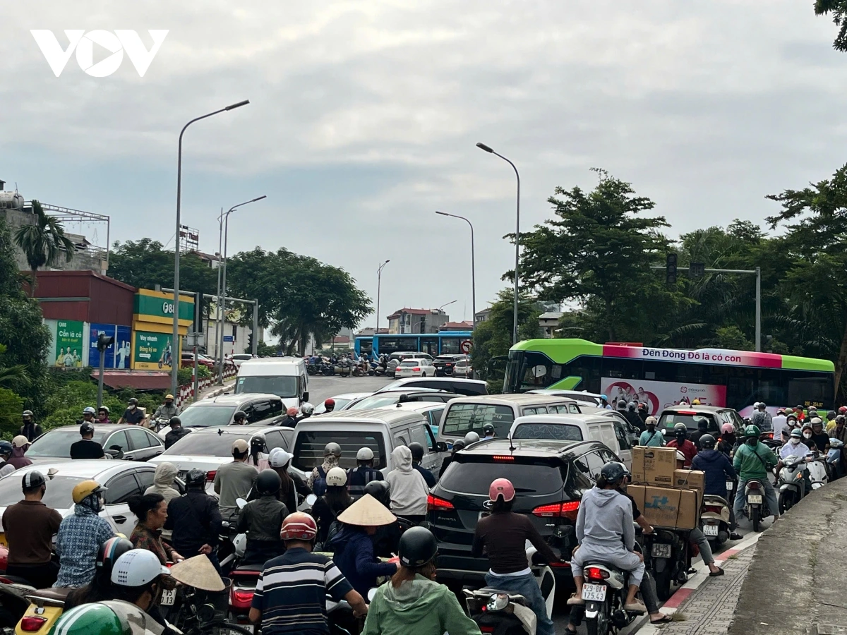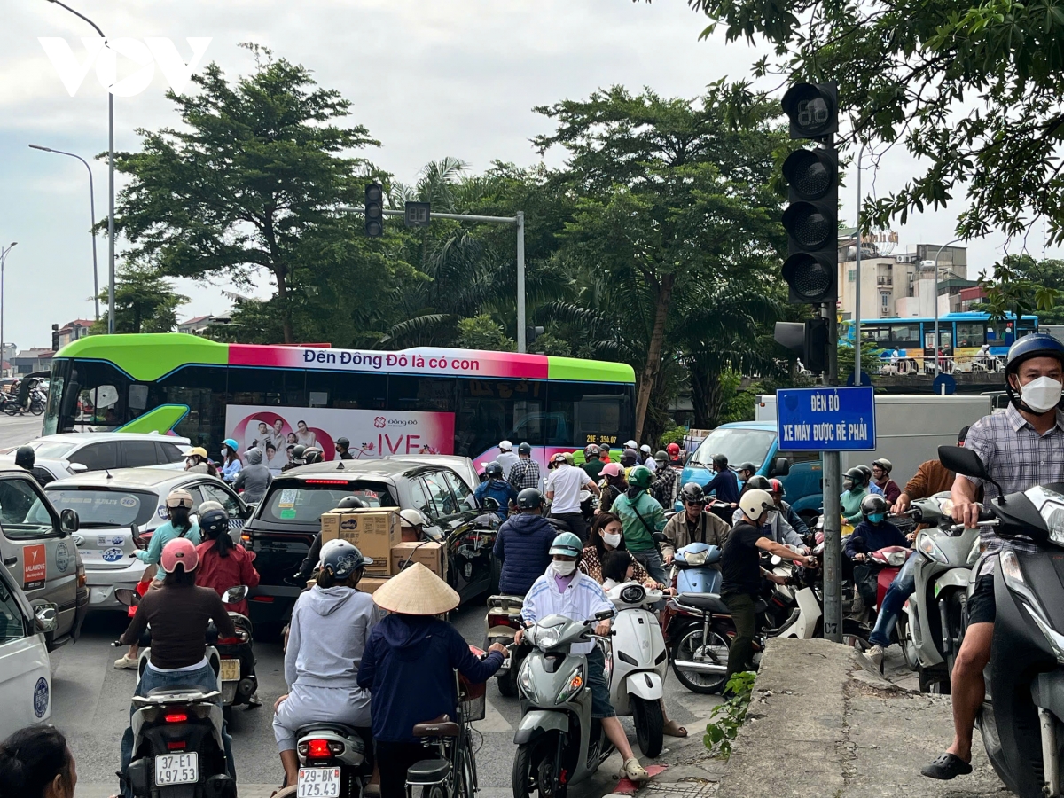 Toàn bộ phương tiện và người tham gia giao thông phải đi đường vòng sang cầu Chương Dương khiến giao thông ùn tắc kéo dài....