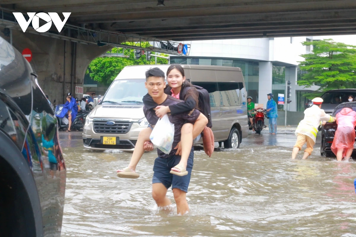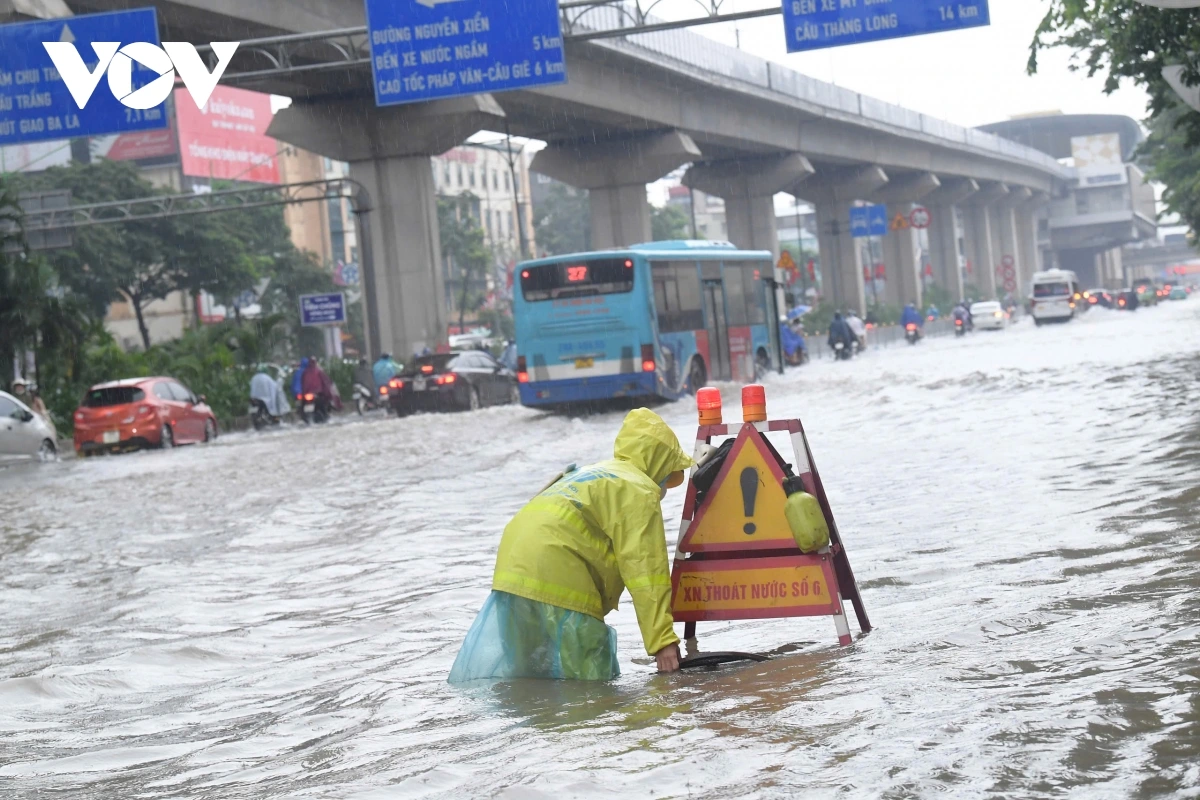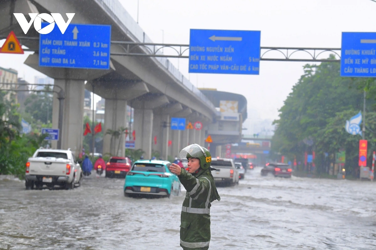 Đội CSGT đường bộ số 7, Phòng CSGT TP Hà Nội cử 10 cán bộ chiến sĩ, phối hợp với công nhân công ty TNHH thoát nước Hà Nội tổ chức phân luồng từ xa, khơi thông các nắp hố ga giúp sớm thoát nước nhanh. Dưới sự hướng dẫn của lực lượng chức năng, các phương tiện di chuyển trật tự, không có phương tiện nào đi vào vùng nước sâu hay gặp sự cố...