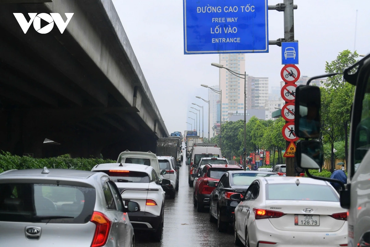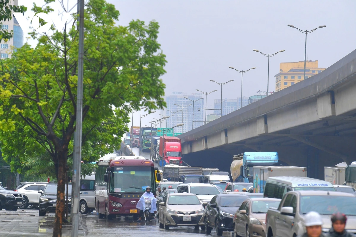 PV Linh Thương/VOV.VN ghi nhận, tại khu vực chân cầu vượt trên đường Lê Quang Đạo, cơn mưa lớn, nhiều phương tiện không thể di chuyển. Người dân buộc phải trú mưa, dừng đỗ tạm dưới gầm cầu và các điểm có mái che để chờ mưa ngớt, khiến khu vực này trở nên đông đúc, giao thông di chuyển chậm.