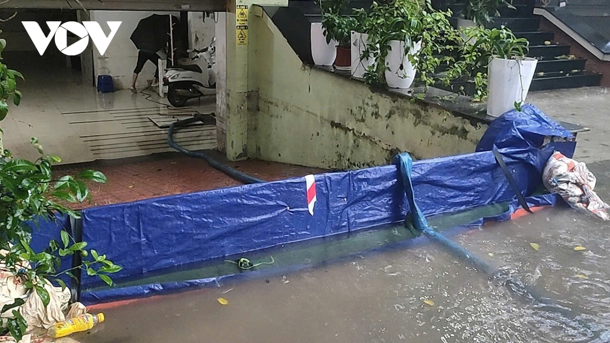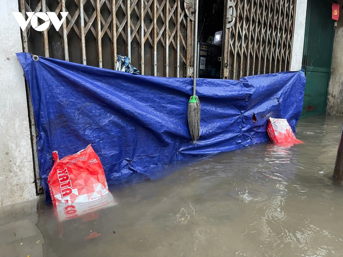 PV Linh Thương/VOV.VN ghi nhận tại một số tuyến phố như Quan Nhân, Nhân Hòa (phường Thanh Xuân), nhiều hộ dân đã chủ động dựng rào chắn nước, căng bạt ngăn nước mưa tràn vào nhà.