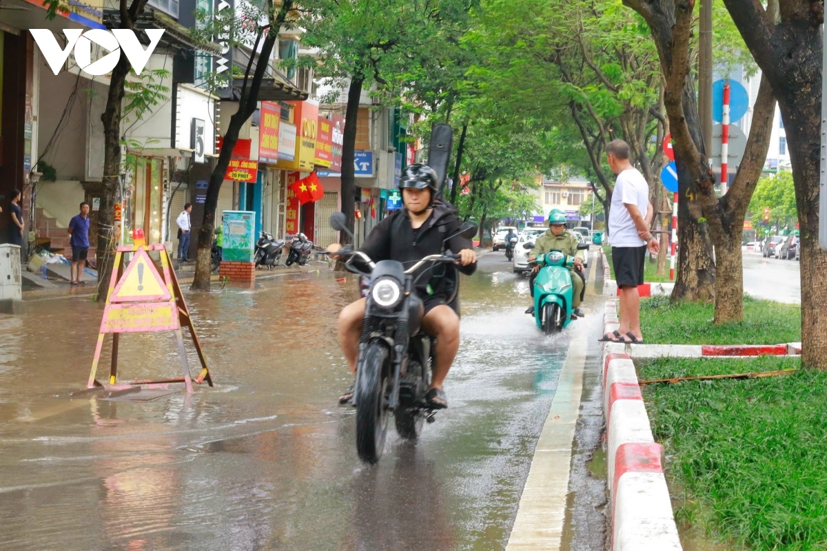 Ghi nhận của phóng viên Phi Long/VOV.VN, trên một số tuyến phố Minh Khai, Lạc Trung, Thanh Nhàn (quận Hai Bà Trưng cũ); đường Lĩnh Nam, Vĩnh Hưng, Kim Ngưu (quận Hoàng Mai cũ) lượng nước đã rút nhanh, không còn ngập sâu trên đường.