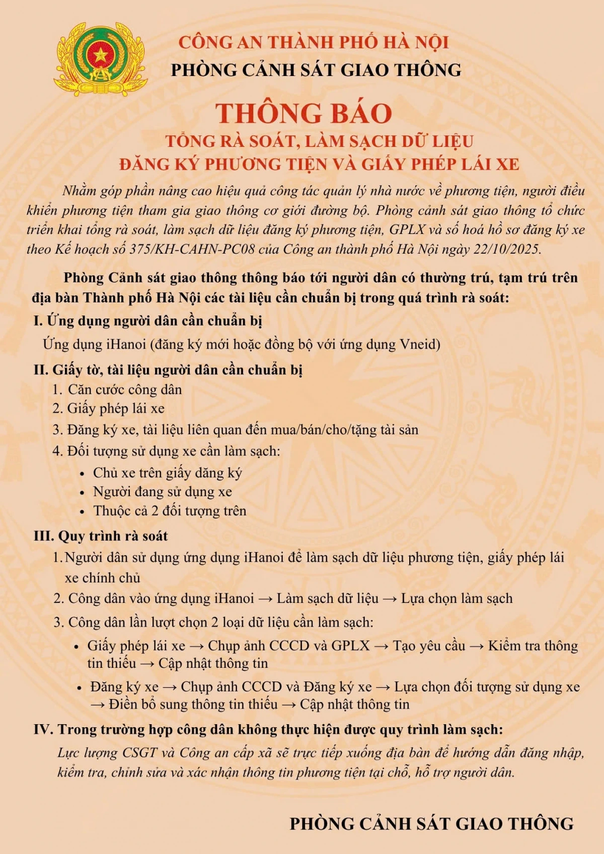 Trước đó, ngày 10/11/2025, Công an thành phố Hà Nội đã tổ chức Hội nghị quán triệt, triển khai Kế hoạch cao điểm 60 ngày đêm tổng rà soát, làm sạch dữ liệu đăng ký phương tiện, giấy phép lái xe trên địa bàn. Kế hoạch này được triển khai theo ý kiến chỉ đạo của lãnh đạo Bộ Công an và Kế hoạch số 6198/KH-C08-P4 ngày 1/10/2025 của Cục Cảnh sát giao thông (C08).