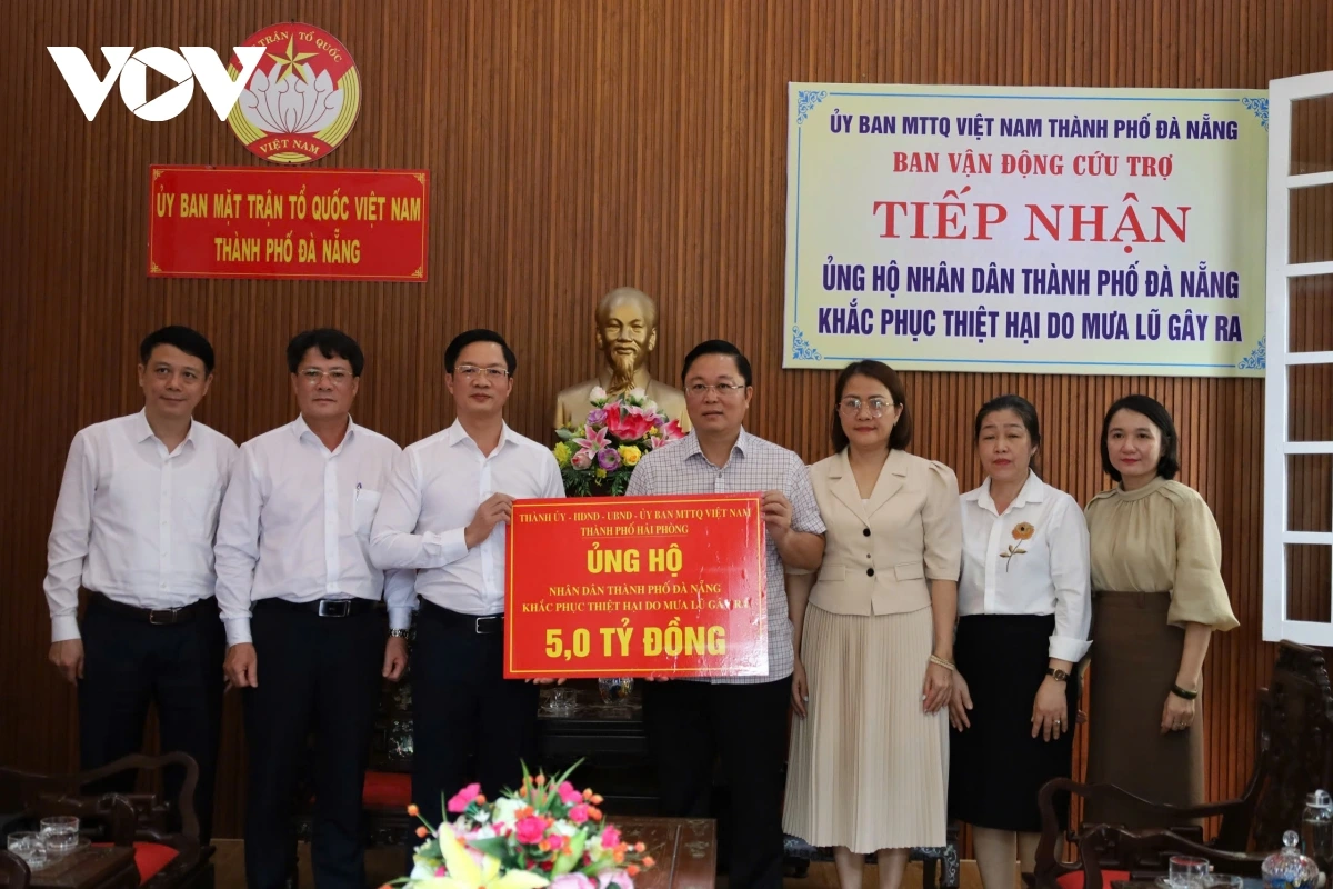VOV.VN - Hôm nay (6/11), đoàn công tác thành phố Hải Phòng do ông Phạm Văn Lập, Phó Bí thư Thành ủy, Chủ tịch Ủy ban Mặt trận Tổ quốc Việt Nam thành phố Hải Phòng làm Trưởng đoàn đã đến Đà Nẵng thăm, trao 5 tỷ đồng hỗ trợ người dân thành phố Đà Nẵng khắc phục thiệt hại do mưa lũ.
