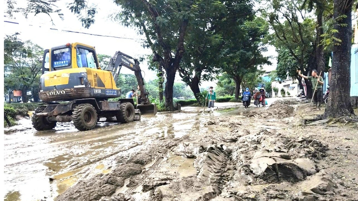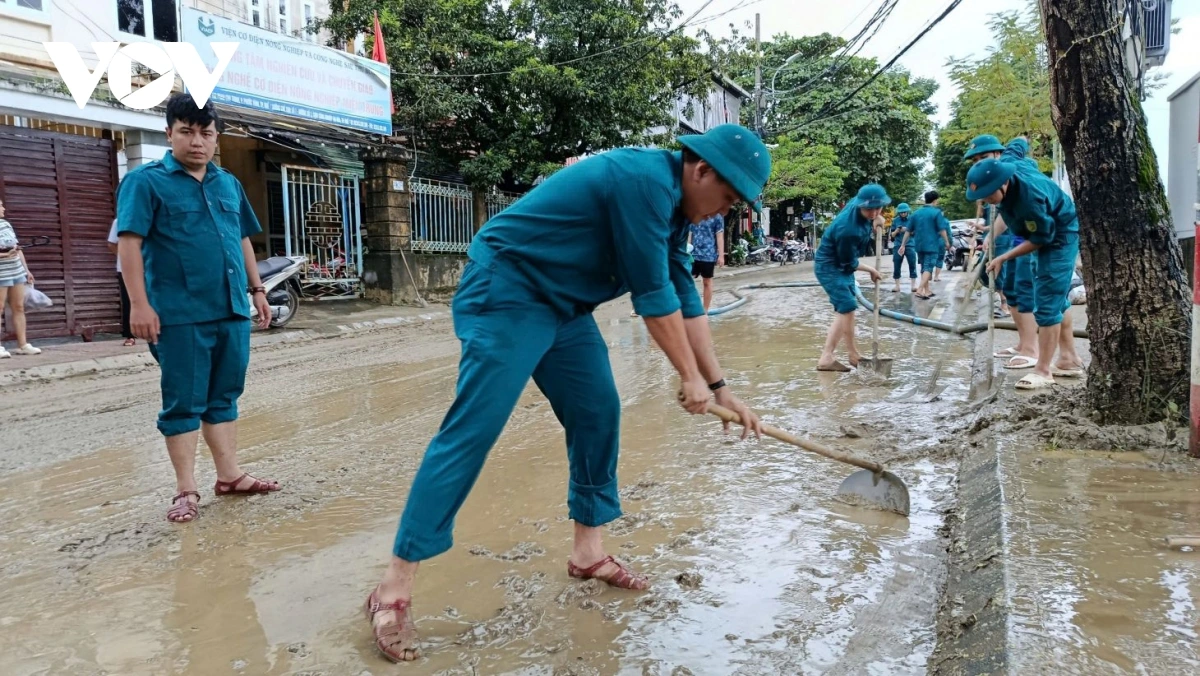 Từ sáng sớm, từng nhóm bộ đội, công an, đoàn viên thanh niên mang theo cuốc, xẻng, máy bơm,… đến khắp các phường bị ngập sâu. Họ san bùn, thu gom rác trên đường phố, rửa sạch sân vườn, đồ dùng sinh hoạt… Tiếng máy bơm xen lẫn tiếng cuốc xẻng tạo nên không khí khẩn trương, ấm áp tình người sau lũ.