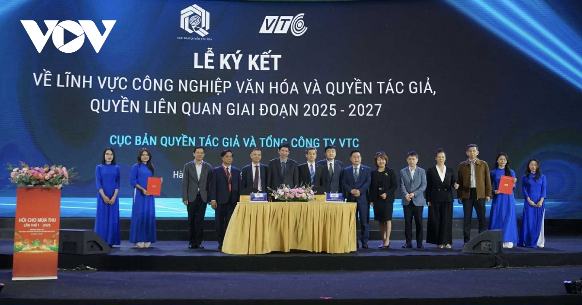 VOV.VN - Chiều 3/11, Trong khuôn khổ Hội chợ Mùa Thu lần thứ nhất – năm 2025, tại Trung tâm Triển lãm quốc gia Việt Nam (Đông Anh, Hà Nội), Cục Bản quyền tác giả và Tổng Công ty VTC phối hợp các đơn vị liên quan tổ chức Lễ ký kết hợp tác giữa các cơ quan, đơn vị, doanh nghiệp trong lĩnh vực văn hoá, thể thao và du lịch
