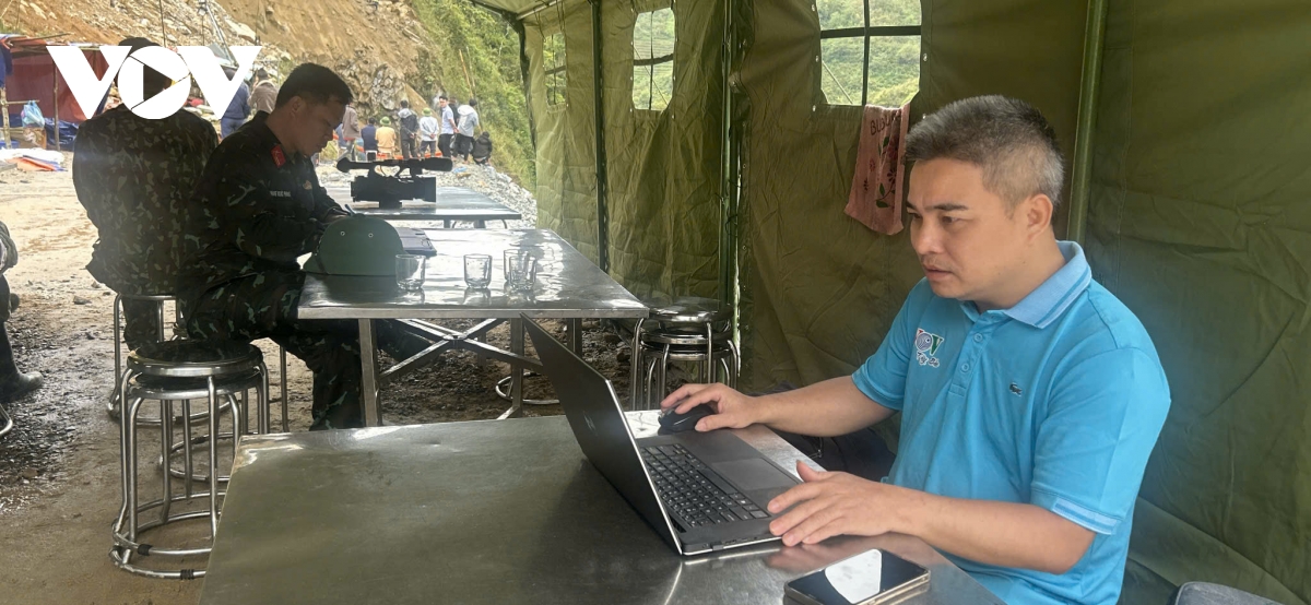 Nhà báo Khắc Kiên cố gắng gửi tin bài tại lán dựng tạm giữa rừng, nơi sóng điện thoại và 4G rất phập phù.