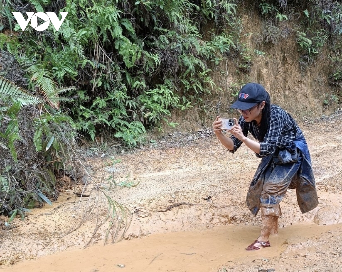 Nữ phóng viên trẻ VOV Tây Bắc khi đi tác nghiệp mùa mưa lũ.