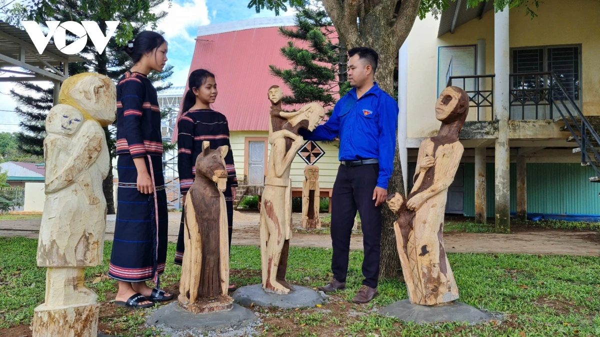 Vườn tượng gỗ Jarai được lắp đặt tại nhà sinh hoạt cộng đồng làng Ia Nueng, xã Biển Hồ