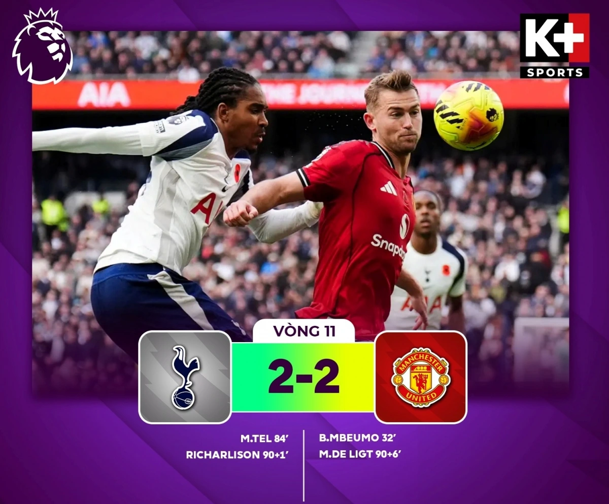 Tottenham và Manchester United hòa 2-2 trong trận cầu giàu cảm xúc tại vòng 11 Ngoại hạng Anh 2025/2026, với hai bàn thắng đến trong thời gian bù giờ hiệp hai.
