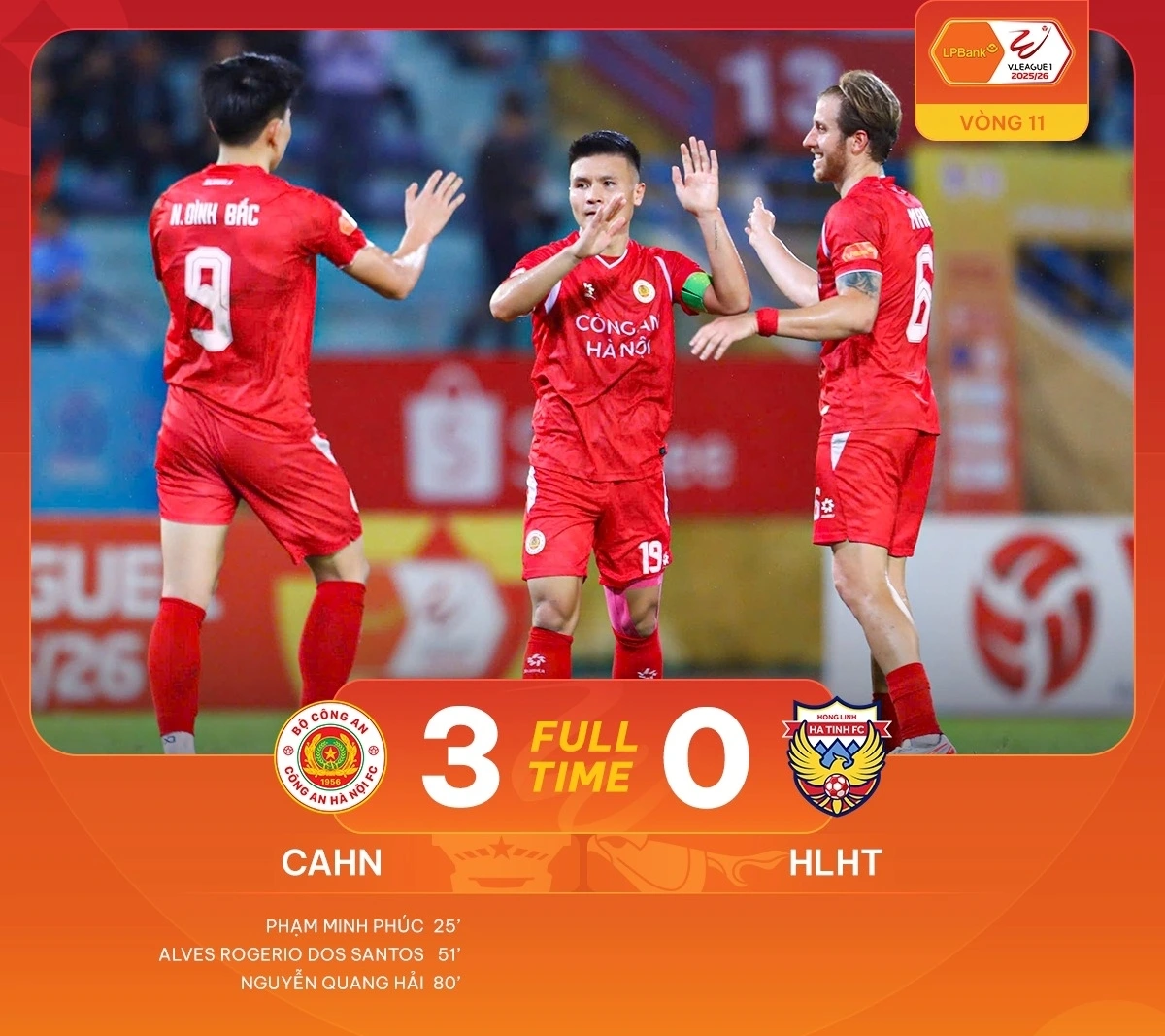VOV.VN - Kết quả vòng 11 V-League 2025/2026, CAHN giành chiến thắng đậm 3-0 trước Hà Tĩnh ở màn so tài tại sân Hàng Đẫy.