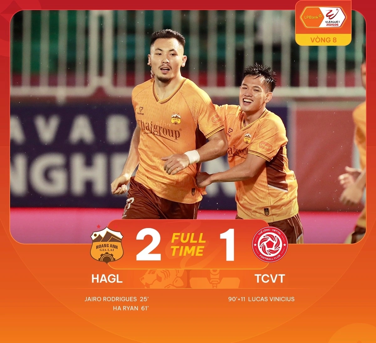 VOV.VN - Kết quả vòng 8 V-League 2025/2026 hôm nay 26/10, HAGL giành chiến thắng 2-1 trước Thể Công Viettel trên sân nhà Pleiku. Đây là chiến thắng đầu tiên của HAGL ở mùa giải năm nay.