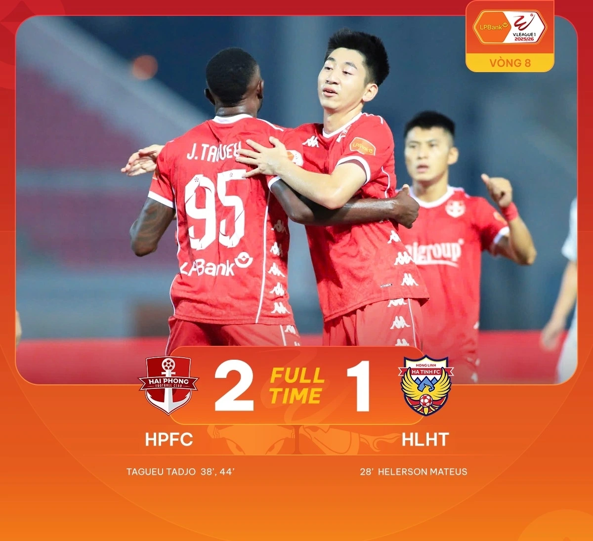 Phút 38 của trận đấu, Tagueu thoát xuống dứt điểm góc gần gỡ hòa 1-1, trước khi chính tiền đạo này hoàn tất cú đúp ở phút 44 sau khi trọng tài tham khảo VAR và công nhận bàn thắng hợp lệ. Mặc dù Fred Friday bỏ lỡ vài cơ hội ngon ăn trong hiệp hai, Hải Phòng vẫn bảo toàn chiến thắng 2-1, để có được 14 điểm, đứng thứ 5 trên bảng xếp hạng.