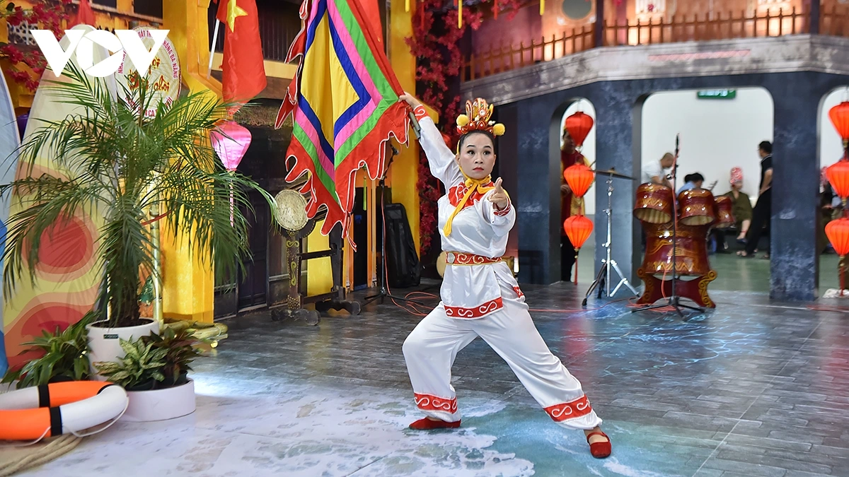 Tại gian hàng thành phố Đà Nẵng trong Hội chợ Mùa Thu lần thứ nhất – năm 2025, dù không phải là ngày cuối tuần nhưng vẫn có khá đông khán giả vây đứng xung quanh một sân khấu nhỏ, nơi những nghệ sĩ Nhà hát nghệ thuật truyền thống Đà Nẵng đang biểu diễn những tiết mục nghệ thuật truyền thống, những “đặc sản” văn hóa của miền Trung và của Đà Nẵng.