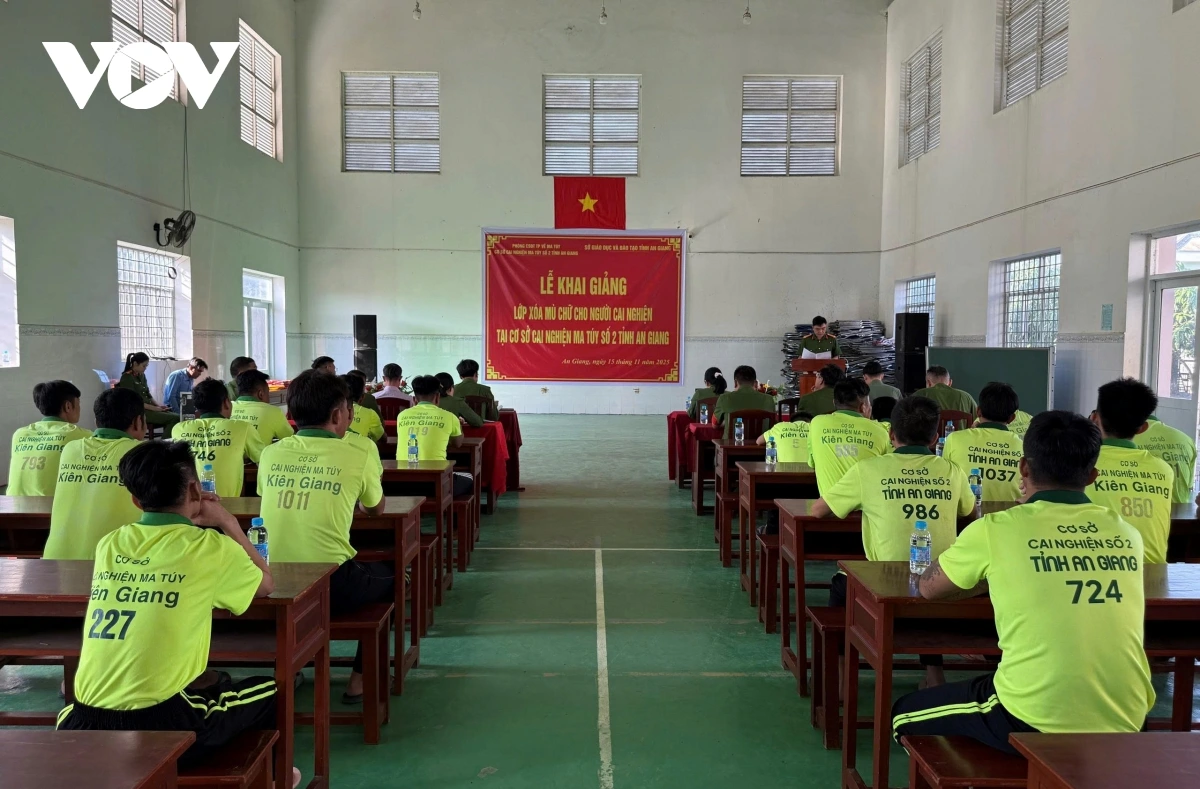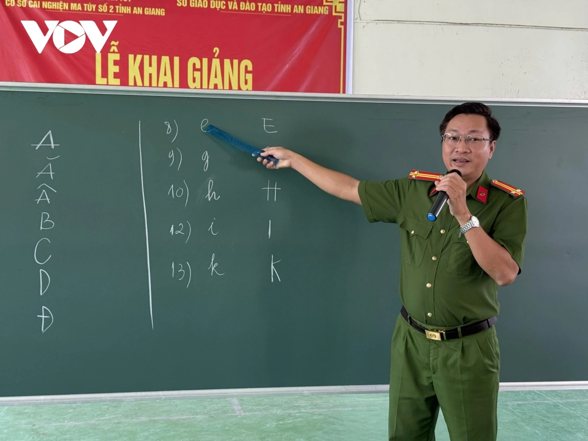 VOV.VN - Sáng ngày 15/11, Phòng Cảnh sát điều tra tội phạm về ma túy Công an tỉnh An Giang phối hợp với Ban Thanh niên Công an tỉnh khai giảng lớp xoá mù chữ dành cho người nghiện đang cai nghiện bắt buộc tại Cơ sở cai nghiện ma túy số 2 tỉnh An Giang.