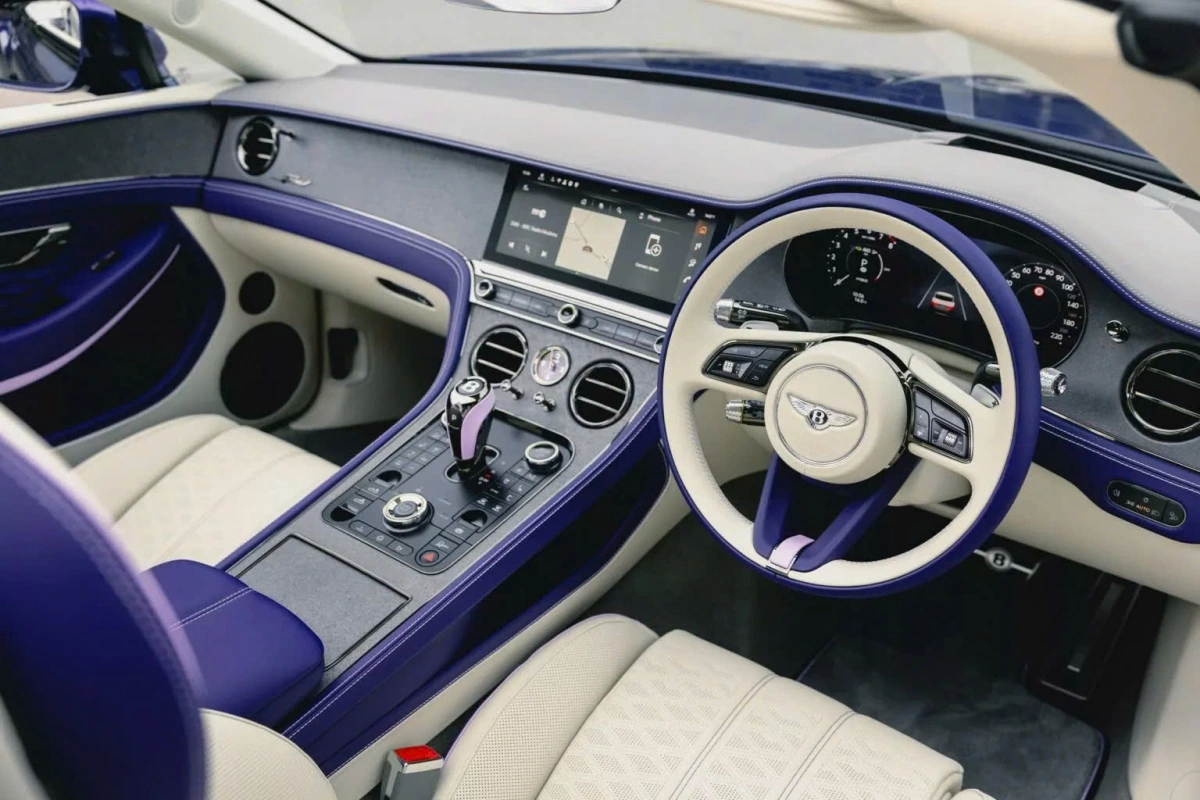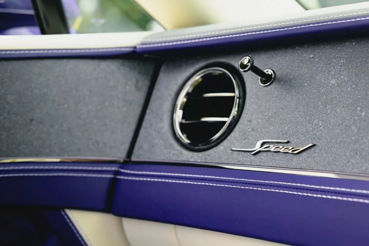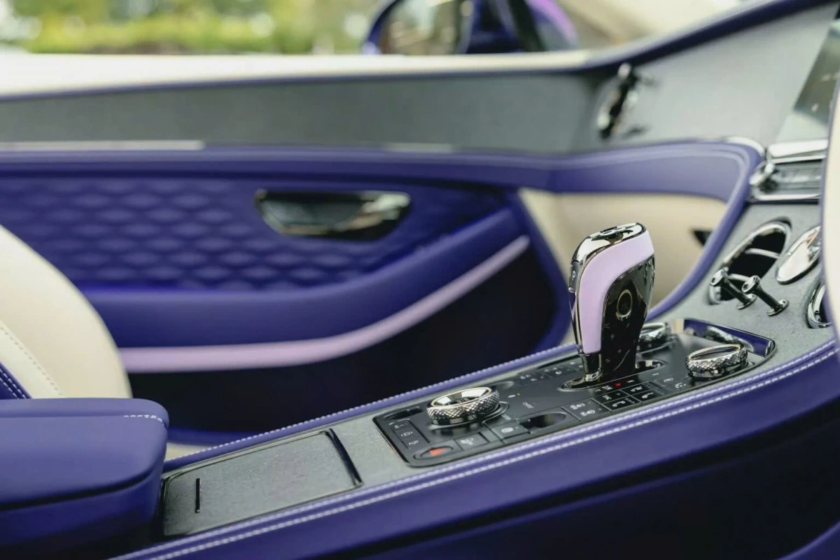 Bên trong, chiếc Continental GTC Speed sở hữu nội thất phối 3 tông màu độc đáo: Da Tanzanite Purple đậm chủ đạo, xen kẽ Lilac nhẹ và Linen sáng để tạo điểm nhấn. Từng đường chỉ khâu, tay nắm cửa, vô-lăng và cần số đều được hoàn thiện thủ công với độ chính xác gần như tuyệt đối.