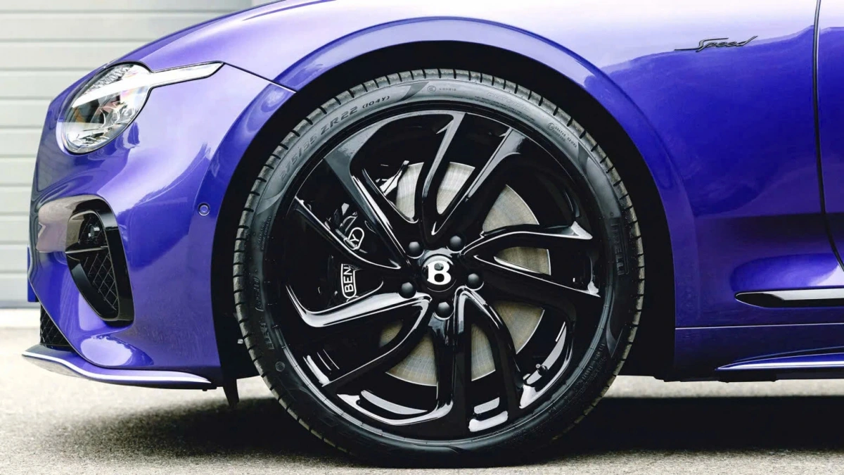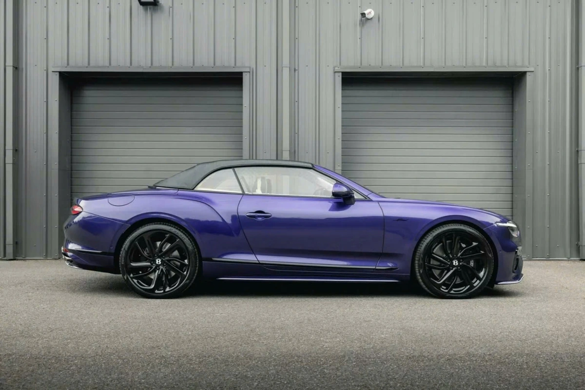 Đi kèm với đó là hàng loạt chi tiết màu đen bóng ở lưới tản nhiệt, logo Bentley, viền cửa sổ, và bộ mâm thể thao, tạo nên vẻ ngoài vừa sang trọng vừa mạnh mẽ. Mui vải màu tối giúp tổng thể xe trở nên hài hòa, tôn lên sắc tím nổi bật của thân xe.