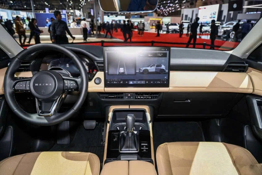 Bên trong khoang lái, Mazda CX-5 2026 gây ấn tượng với thiết kế nội thất hoàn toàn mới, mang đậm phong cách hiện đại và tinh giản. Bảng điều khiển trung tâm được tái thiết kế với một màn hình cảm ứng lớn đặt nổi ở vị trí trung tâm, kích thước 12,9 hoặc 15,6 inch tùy phiên bản. Màn hình này tích hợp hầu hết các chức năng điều khiển chính của xe, bao gồm cả hệ thống điều hòa tự động, nhằm giảm thiểu các nút bấm vật lý và mang lại trải nghiệm gọn gàng, công nghệ hơn.