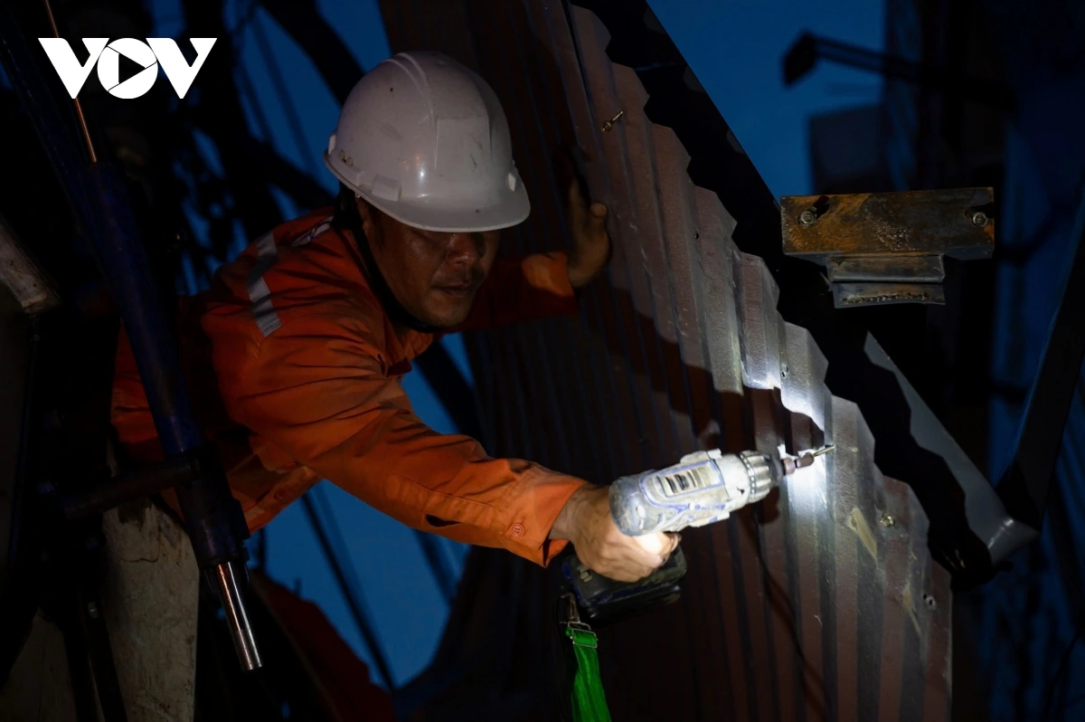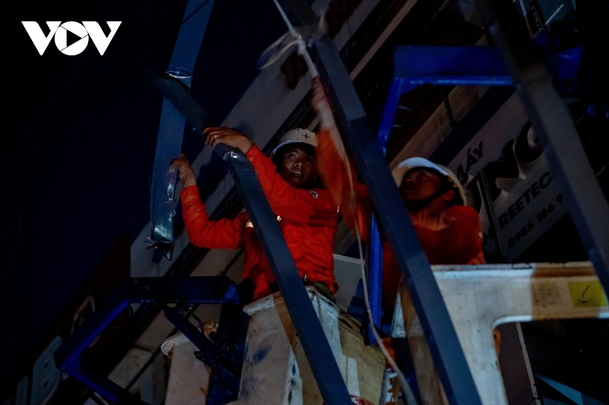 Hai nhân viên khác đang nỗ lực đóng thử cầu dao tại một trạm biến áp ở phường Sông Cầu trong đêm 6/11.