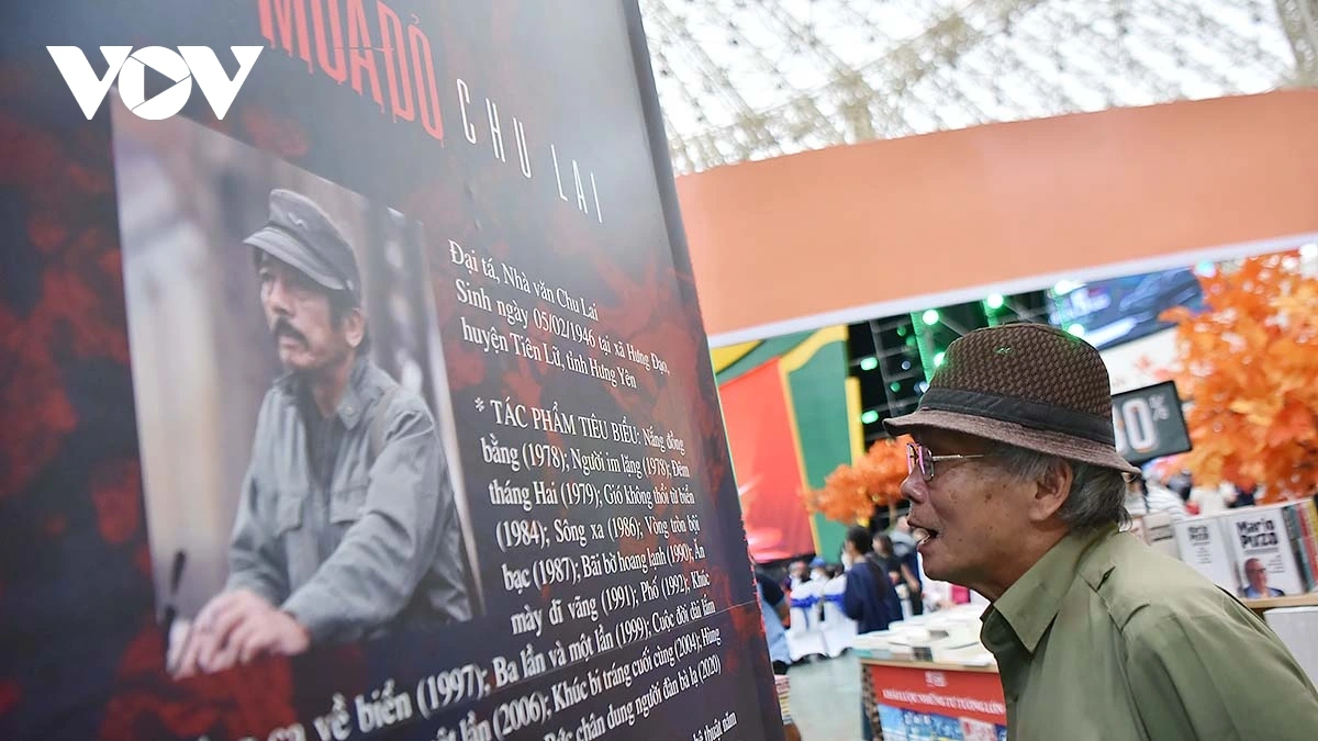 Một độc giả cao tuổi đang xem giới thiệu tác phẩm Mưa Đỏ của nhà văn Chu Lai, cuốn tiểu thuyết đã được dựng thành phim điện ảnh ăn khách nhất thời gian vừa qua.