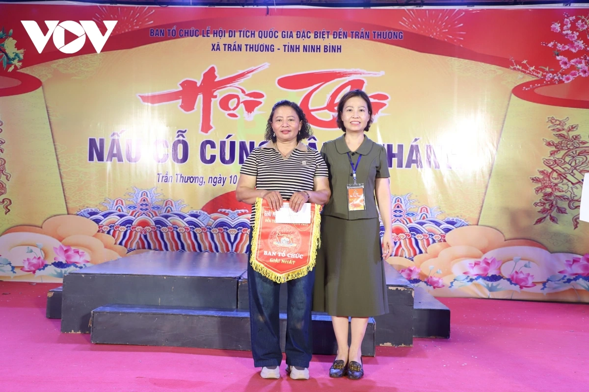Bà Nguyễn Thị Quyên Chủ tịch UBMT tổ quốc và ông Lê Anh Tuấn phó Chủ tịch UBND xã Trần Thương trao giải ba cho các đội trong phần thi nấu cỗ.