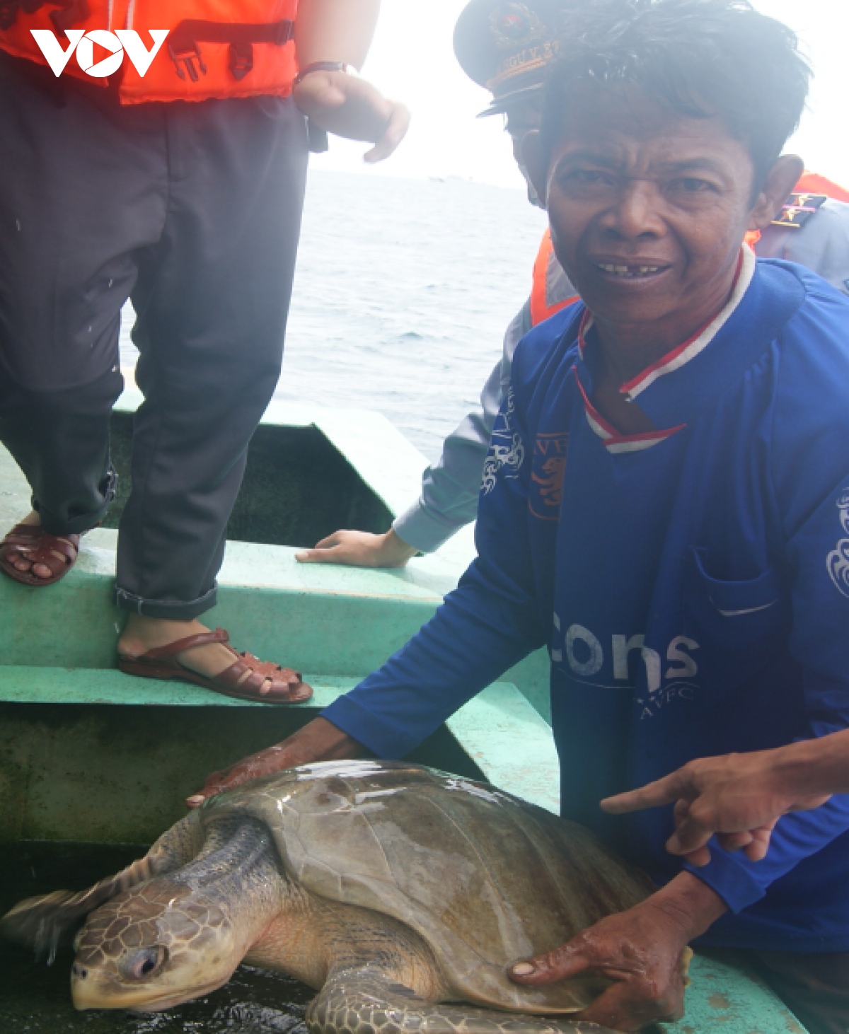 Ngay sau đó, cán bộ thuyền viên tàu KN568 cùng với ngư dân tàu cá BL 91699TS tổ chức thả cá thể đồi mồi dứa về môi trường tự nhiên.