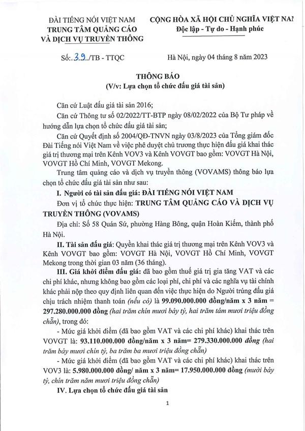 VOVVN - VOV.VN - Đài Tiếng nói Việt Nam đấu giá quyền khai thác giá trị thương mại trên Kênh VOV3 và kênh VOVGTT.