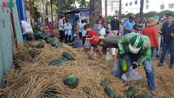 VOVVN - VOV.VN - Hôm nay (11/2), một số cá nhân, đơn vị tại TPHCM đã bỏ tiền túi thu mua hàng chục tấn dưa hấu, sau đó phát tặng miễn phí cho người dân.