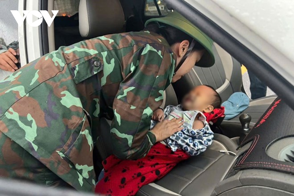 Lực lượng đã trưng dụng chiếc xe của Ban chỉ huy để đưa cháu bé đến bệnh viện. Lúc này cháu bé không khóc được, ý thức lờ đờ.