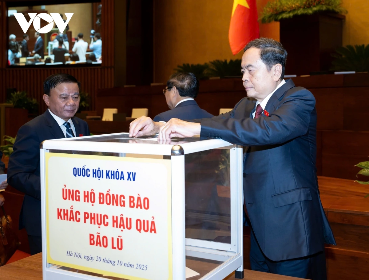 Chia sẻ với nhân dân cả nước về thiệt hại trong các đợt bão lũ vừa qua, Quốc hội đã tổ chức quyên góp ủng hộ đồng bào khắc phục hậu quả thiên tai, bão lũ với mức ủng hộ tối thiểu tương đương một ngày lương.