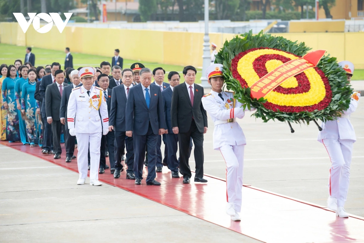 Tổng Bí thư Tô Lâm, Chủ tịch nước Lương Cường, Thủ tướng Phạm Minh Chính, Chủ tịch Quốc hội Trần Thanh Mẫn cùng các đại biểu vào Lăng viếng Chủ tịch Hồ Chí Minh