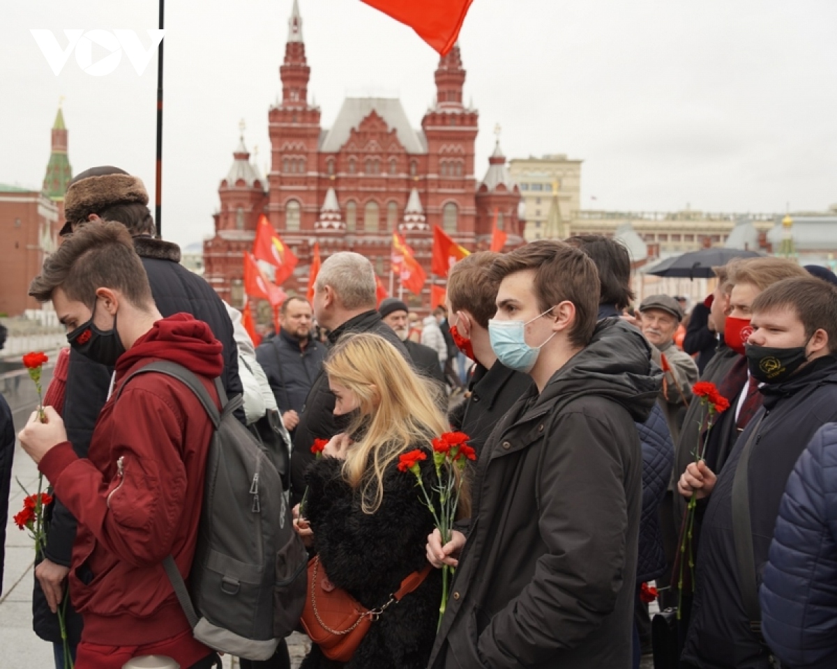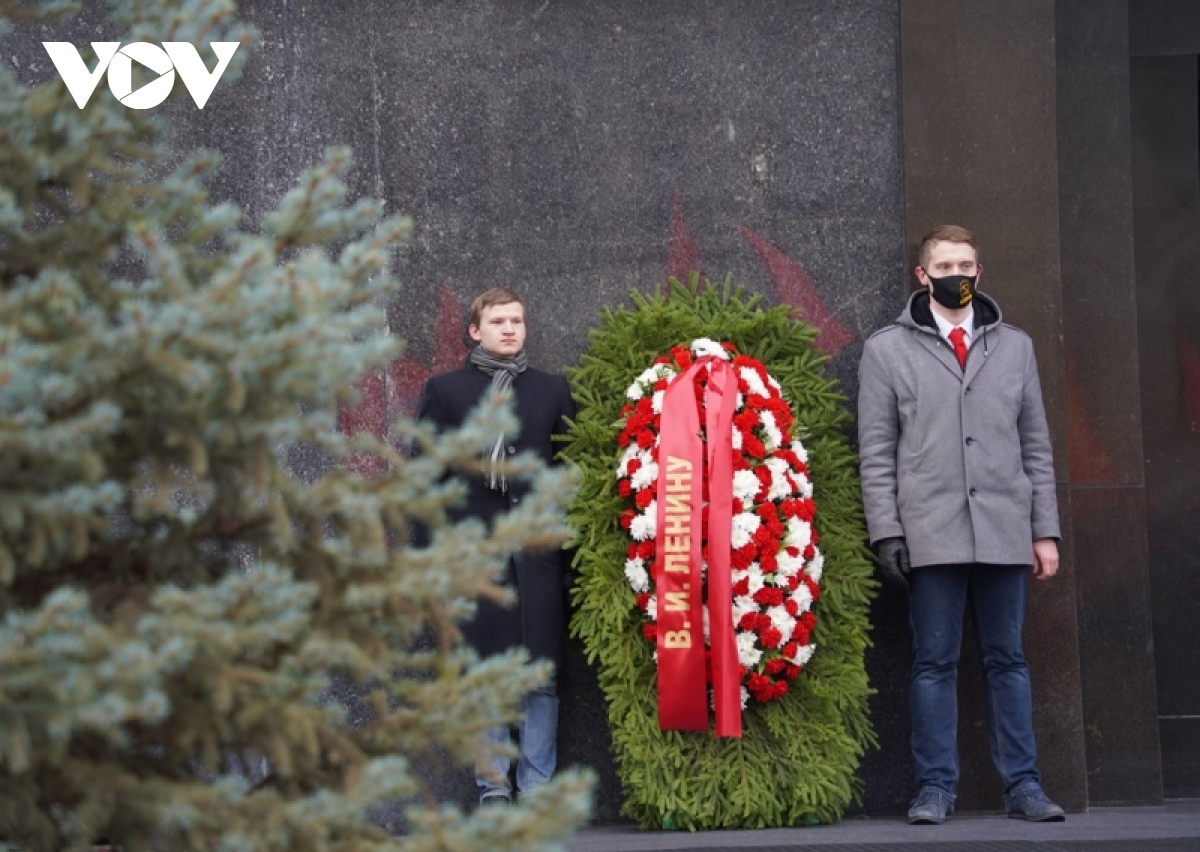 VOV.VN - Nhân kỷ niệm 103 năm ngày thành lập Đoàn thanh niên cộng sản Lenin (Komsomol), các đại biểu của Đảng cộng sản Liên bang Nga, đoàn viên Komsomol, thành viên của các tổ chức xã hội thuộc phong trào yêu nước đã tổ chức lễ đặt hoa và viếng lăng Lenin trên Quảng trường Đỏ (Moscow, Nga).