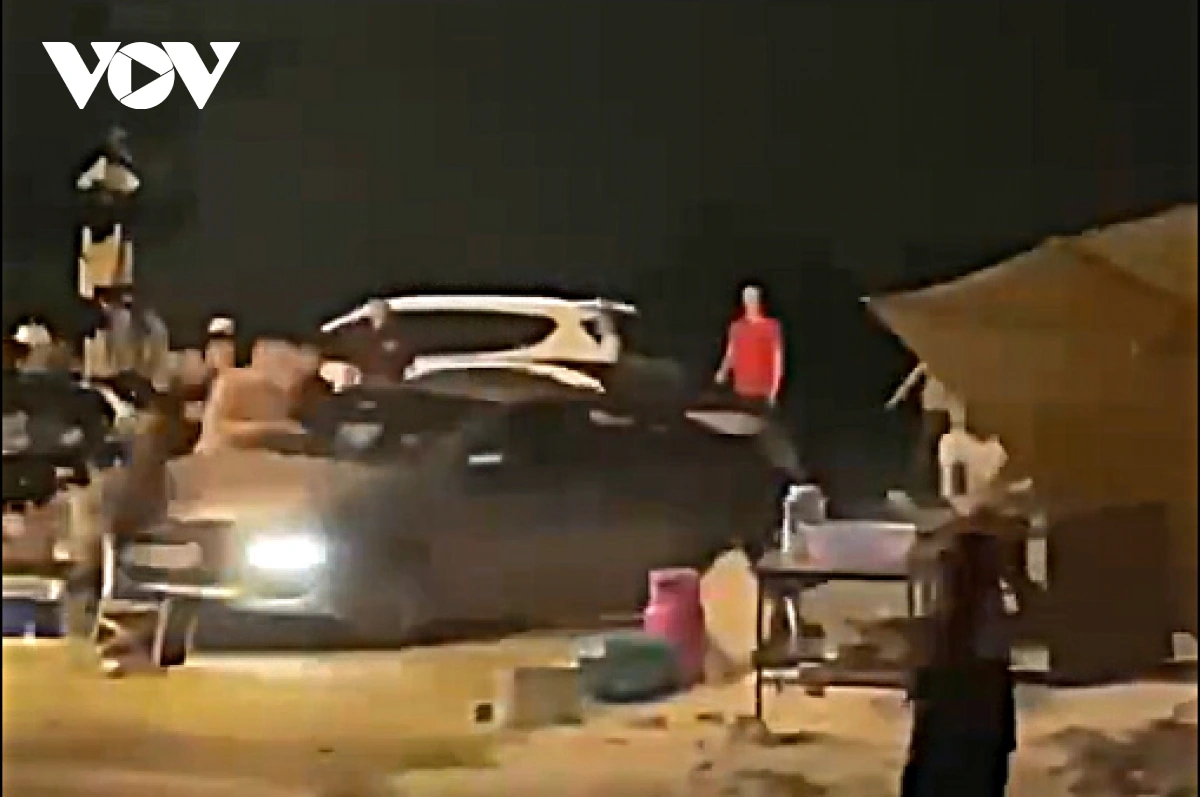 VOV.VN - Xe ô tô con màu xám liên tục tăng ga lùi rồi tiến, xung quanh có nhiều người lớn cầm gậy, vật dụng tấn công xe tạo nên cảnh hỗn loạn trong đêm.