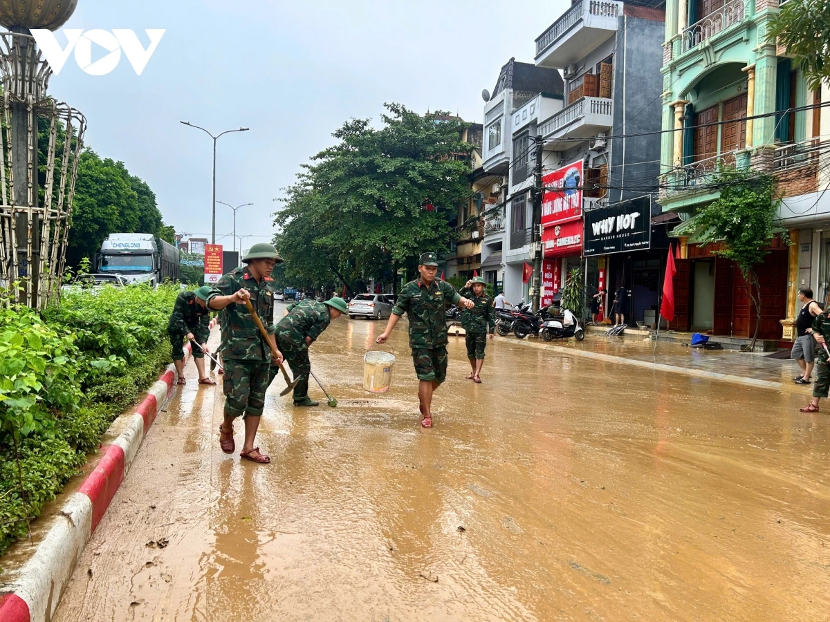 VOV.VN - Tại nhiều vùng ngập lụt ở Lào Cai mưa đã tạnh, nước bắt đầu rút dần, chính quyền địa phương cùng các lực lượng, người dân địa phương đang tập trung khắc phục hậu quả mưa lũ, hót dọn bùn, san gạt thông đường.
