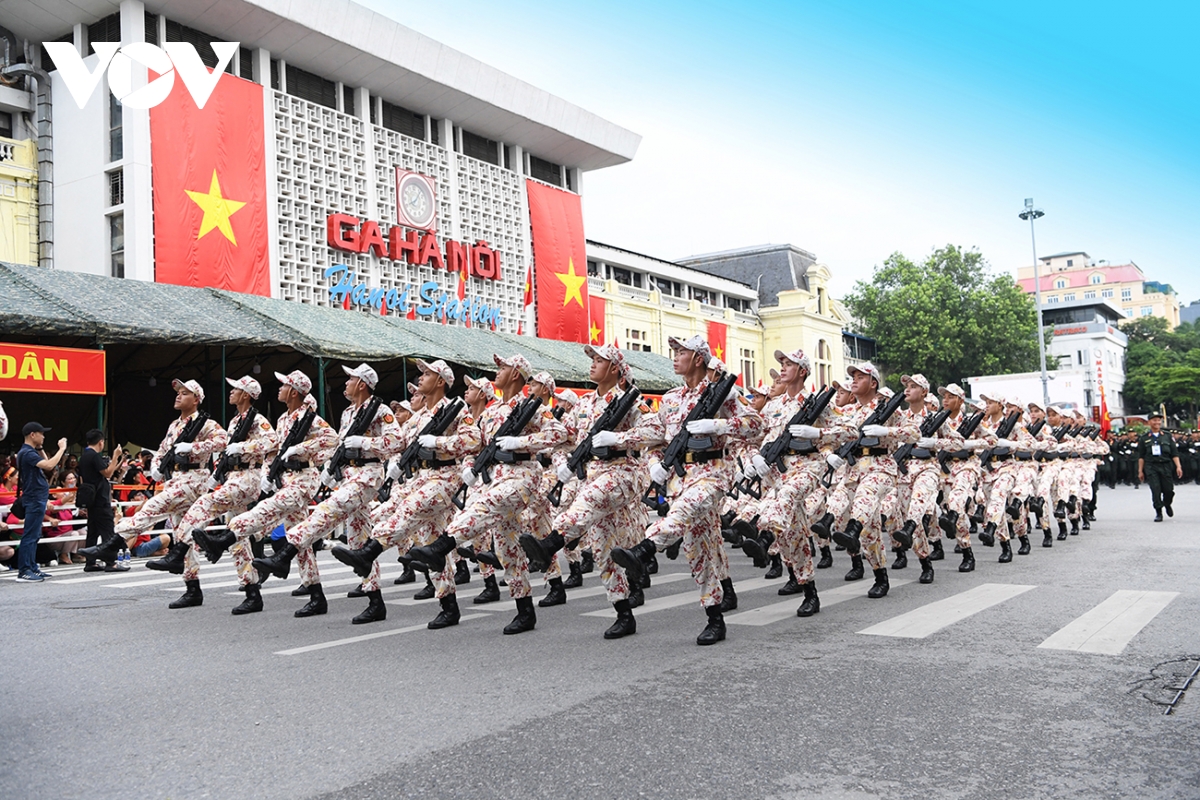Ga Hà Nội là một trong những cơ sở đầu tiên được lực lượng ta tiếp quản từ quân Pháp vào sáng 9/10/1954. Đến nay, những chuyến tàu vẫn khởi hành ngày đêm suốt 70 năm qua. Trong ảnh: Khối nam sĩ quan An ninh mạng và phòng, chống tội phạm sử dụng công nghệ cao diễu binh, diễu hành mừng 80 năm Quốc khánh qua ga Hà Nội.