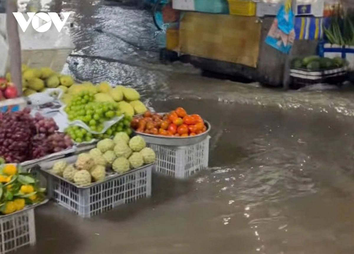 VOV.VN - Ngày 9/10, nước triều tràn vào chợ Cổ Cò (xã Mỹ Lợi, tỉnh Đồng Tháp) gây ảnh hưởng đến việc buôn bán kinh doanh của các hộ tiểu thương. Tại cù lao Ngũ Hiệp, Tân Phong, nước từ sông Tiền tràn qua đường giao thông, uy hiếp vườn cây sầu riêng.