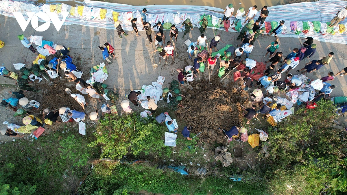 Nhân dân và bộ đội khẩn trương xúc đất vào bao tải xếp hàng chặn dòng nước lũ tràn qua đê.