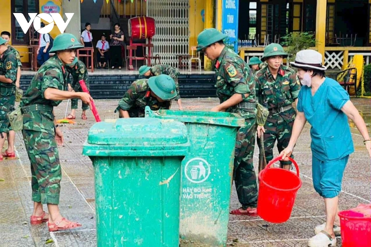 Hiện, các địa phương vùng rốn lũ tập trung dọn dẹp vệ sinh, sớm ổn định cuộc sống và đưa các hoạt động trở lại bình thường. Ông Nguyễn Xuân Tâm, Hiệu trưởng Trường Tiểu học số 2 Bình Minh, xã Bình Minh, tỉnh Quảng Ngãi cho biết, sau mưa lũ, nhà trường tập trung dọn dẹp vệ sinh, sớm đưa học sinh trở lại trường: “Các phòng học đều bị bùn phủ một lớp dày. Ngoài sân, đặc biệt là khu vực sân trường, bùn đọng rất dày nên phải nhờ lực lượng bộ đội và dân quân đến hỗ trợ dọn dẹp. Về hư hỏng thì có khoảng 50 mét vuông gạch bị nước cuốn trôi, tạo thành hố sâu. Ngay trước cổng trường cũng bị sạt, tạo một hố khá lớn".