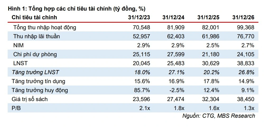 MBS dự báo TTTD cả năm 2025 sẽ đạt xấp xỉ 18% cùng với NIM duy trì quanh mức 2,5% giúp thu nhập lãi thuần đi ngang so với cùng kỳ. Thu ngoài lãi tăng 2,6% so với cùng kỳ với giả định thu nhập từ xử lý nợ đạt khoảng 9.000 tỷ đồng. Chi phí trích lập giảm 23,3% là yếu tố chính giúp lợi nhuận sau thuế (LNST) tăng 20,5% so với cùng kỳ, hoàn thành 100% kế hoạch cả năm. Đối với 2026, MBS dự báo TTTD sẽ hạ xuống mức 15% trong khi NIM sẽ nhích nhẹ lên mức 2,7%.