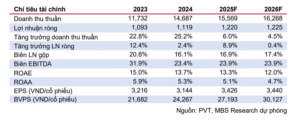 MBS khuyến nghị khả quan đối với cổ phiếu PVT với giá mục tiêu 22.000 đồng/cổ phiếu Giá mục tiêu giảm 13% so với báo cáo trước do dự kiến tốc độ mở rộng đội tàu chậm hơn so với trước, giảm dự phóng giá cho thuê tàu do tăng trưởng cung tàu toàn cầu cao hơn cầu, đặc biệt đối với tàu loại nhỏ (chiếm đa số tại PVT). Giá cổ phiếu đã giảm 25,6% so với mức đỉnh trong 2024, hiện tại đã về vùng giá hấp dẫn với EV/EBITDA thấp hơn 16,3% so với trung bình 5 năm, do đó, đây là thời điểm phù hợp để tích lũy cho cổ phiếu PVT.